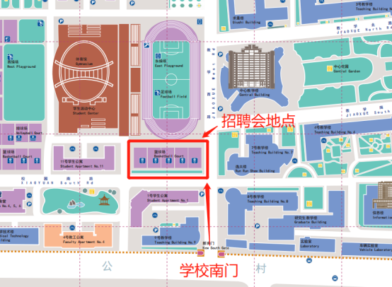 南门进校,进校后按照指定路线直接前往招聘场地布置现场。