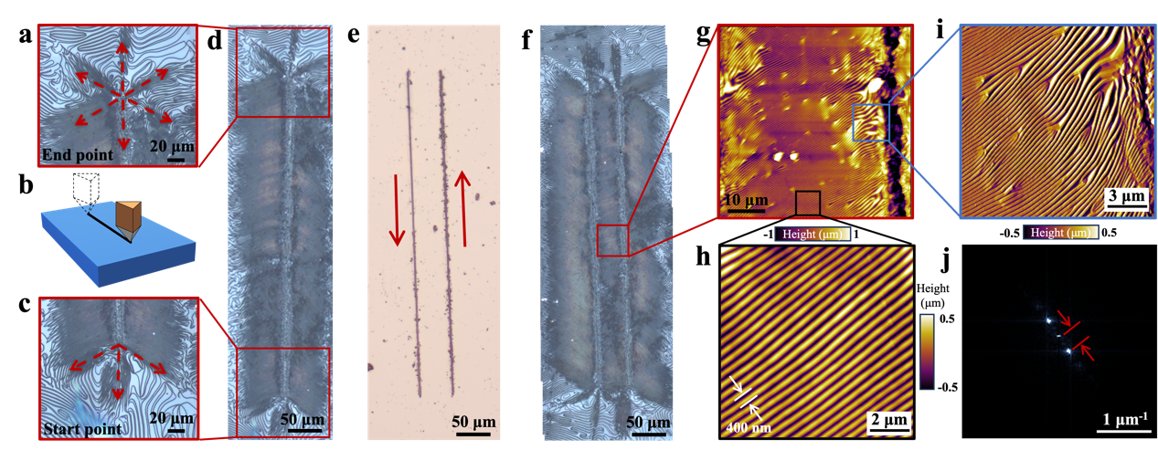 基于纳米压痕单点调控局域涡旋畴分布的机制,研究团队通过采用纳米划痕法,扩大了涡旋畴的调控范围(图2),在划痕调控涡旋畴分布策略的基础上,研究团队设计了两条反平行分布的划痕。实现了50 mm宽,周期为400 nm的单一手性高密度条纹畴,并且分布范围可以随着划痕的长度延长至整个单晶长度。为了揭示纳米划痕引入的应变分布状态,研究团队采对划痕附近的应变状态进行表征,结果表明面内应变的分布范围比面外应变分布范围大三个数量级,因此面内应变分布在力学调控拓扑微结构构型与有序度的过程中起着主要作用。