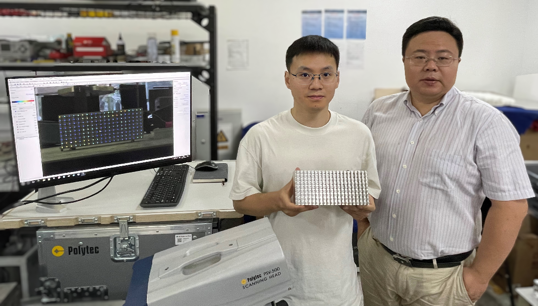 朱睿教授(右)和博士研究生胡洲(左)展示了他们制备的弹性表面波拓扑输运的金属样品