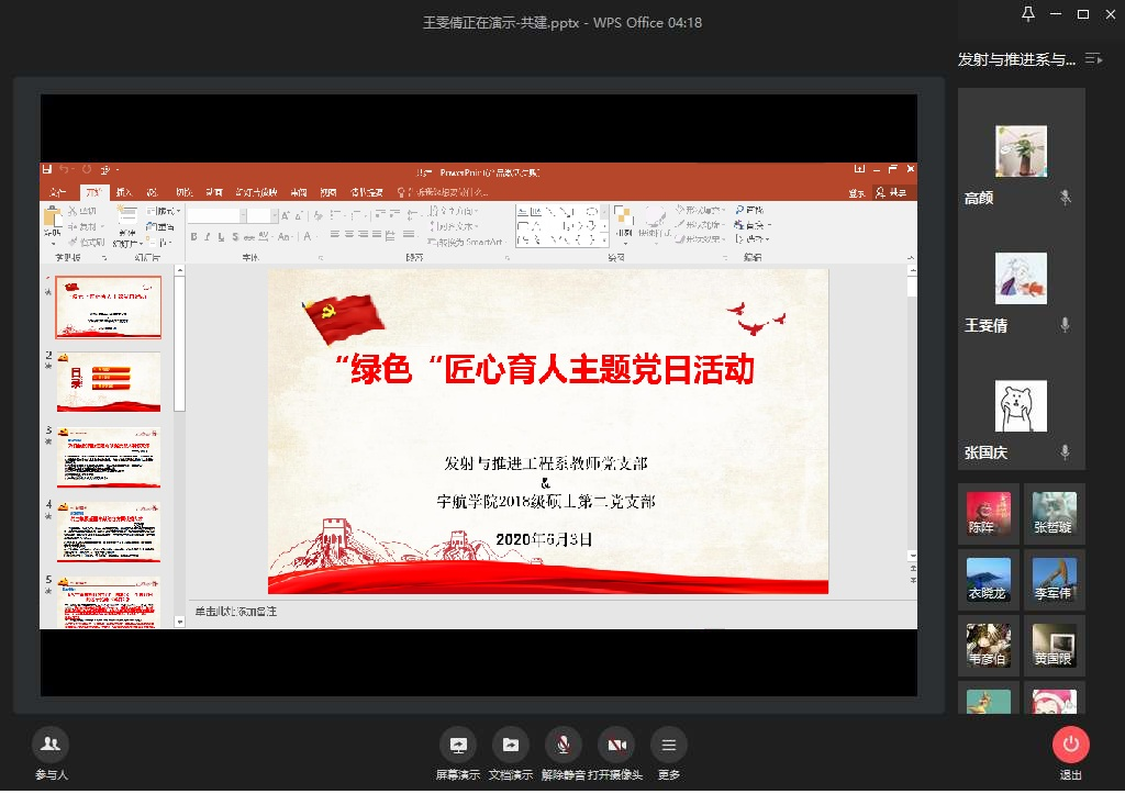 发射与推进工程系党支部与2018级硕士第二党支部共同开展了“绿色”匠心育人主题党日活动。发射与推进工程系党支部18名教师党员和学生党支部21名学生党员参加了此次活动。会议由教师党支部书记和学生党支部书记共同主持。