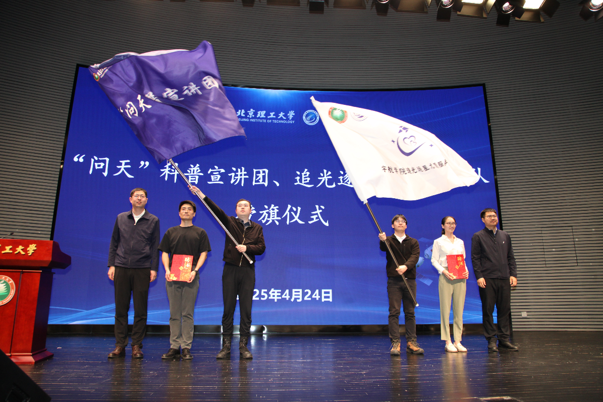 成立的“问天科普宣讲团”与“追光逐星志愿服务队”授旗。学生代表庄严承诺,将用专业知识传播航天文化,以志愿行动践行社会责任。