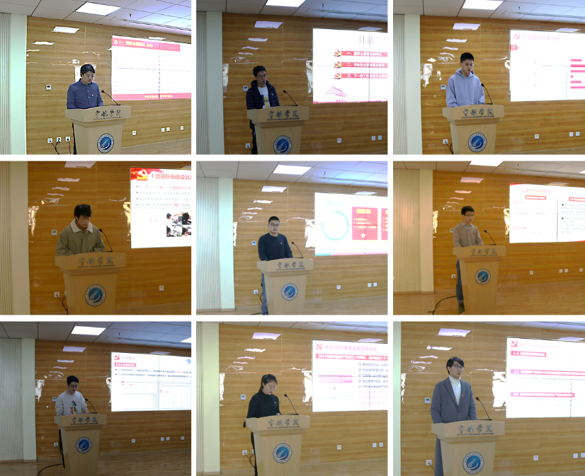 1名教工党支部书记和8名学生党支部书记围绕履职主要情况、特色工作、存在的主要问题和原因、下一步工作思路和主要举措等方面进行现场述职,其余22位党支部书记进行书面述职。