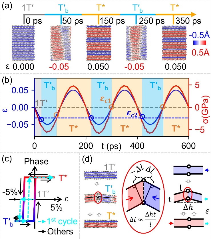研究发现,高频单轴拉压循环载荷驱动下(图1),多层1T’-MoTe2可稳定实现厚度方向随机堆垛相T*和一种新亚稳态褶皱相T’b间的可逆切换(图2)。该新T’b相具有面外褶皱,且只在一定的压应变下出现。随着应变由压缩转为拉伸,T’b相的褶皱结构将被拉平转变为T*相。分子动力学结果表明,T’b和T*相互切换的临界应变存在稳定的数值差异,使得此类相变具有铁弹性(图2c)。