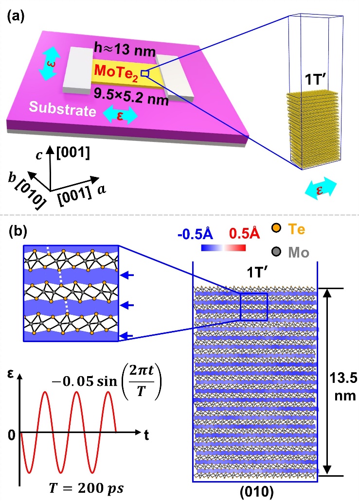 MoTe2具有低维和多相的特点。实验表明,MoTe2层内可逆结构相变非常缓慢,应变驱动的相变周期可达数分钟,对电子器件的应用十分不利。最近实验发现,循环应变载荷作用下的多层1T’相MoTe2可实现快速可逆结构相变及材料电导率突变,切换周期可缩短至纳秒级,但这种高频可逆相变的微观机制尚不清楚。