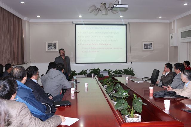 上午10时在3号楼会议室做了题名为“New Routes to Particle Synthesis: Making particles one by one”的学术报告。报告会上Weitz 教授系统介绍了自己的团队在微流控领域最新的科研课题和研究成果。他指出,使用微流体装置来精确控制流体的流量可以制造滴剂,而滴剂在实际生活中有广泛的应用,可以研制很难用任何其他方法合成的新材料。最后,Weitz教授简单介绍了该研究成果在药物封装、化妆品生产等技术上的应用。