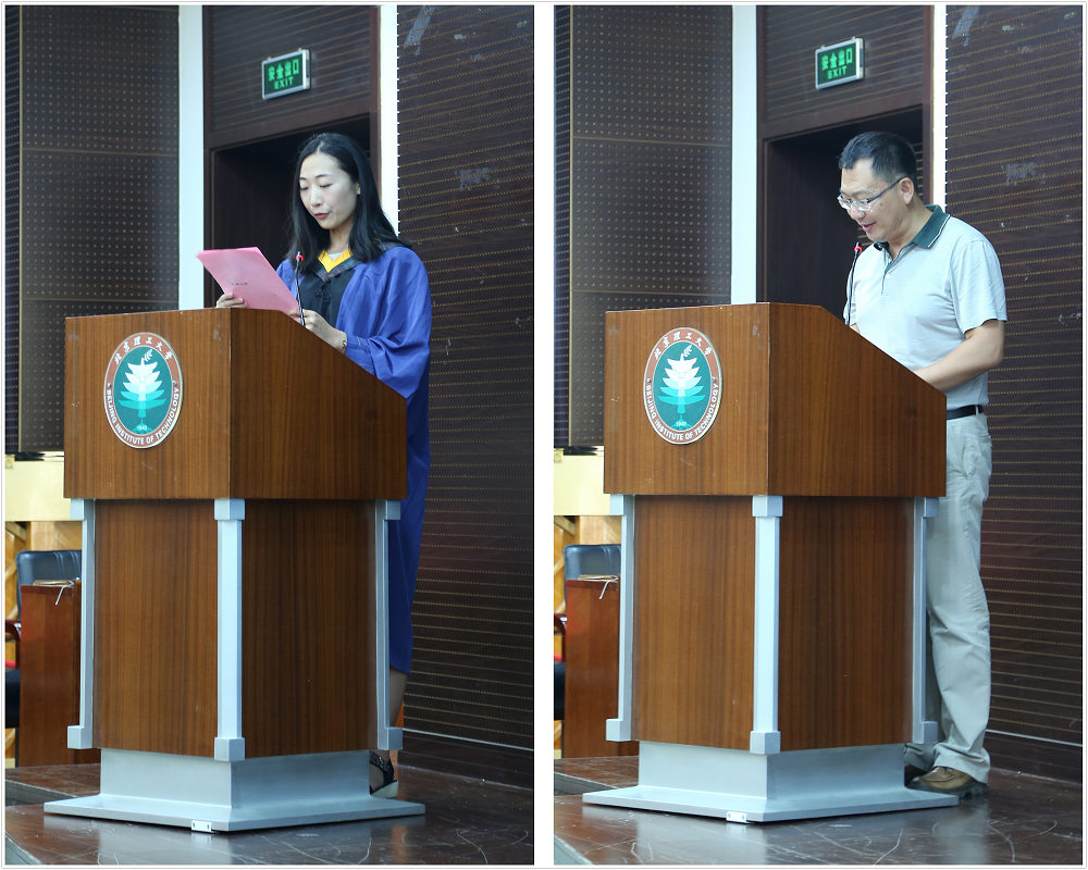 毕业生代表张未采用一种独特的形式进行了发言。她将所思所感融入到了毕业论文的致谢当中,并以文言文的格式表达了对老师辛勤指导的感谢,对同学情深的不舍,对美好未来的期盼。“同求学者,是为同门;同勉励者,是为兄弟。”相信这代表了所有毕业生的心声。在最后她大声地发出了“水激浪涌,沧海已近。天高海阔,扬帆振翅,与诸君同勉!”的呼唤,希望各位同学再接再厉,为母校争光。
