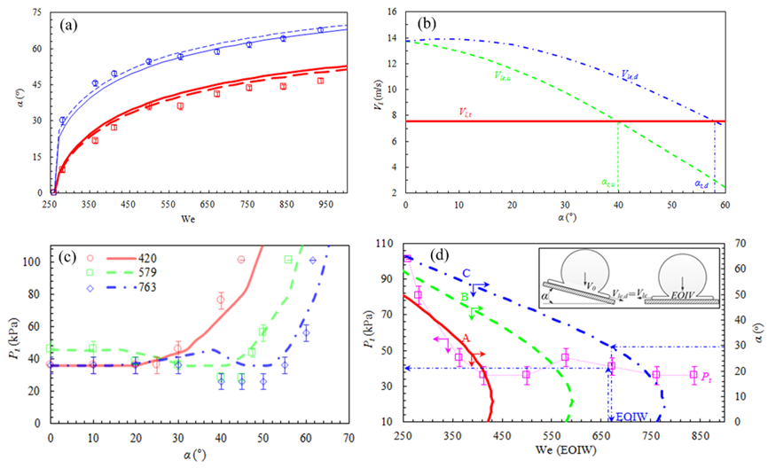 作为吸引人同时也是难理解的流体力学现象,前人针对液滴飞溅的研究主要集中于垂直撞击,而自然界和一系列工程应用中的大部分撞击都是倾斜的,液滴撞击倾斜表面引起非对称飞溅并最终抑制飞溅的机理尚未被理解。论文通过在真空室中开展液滴倾斜撞击实验,研究了液滴在不同环境压力下撞击倾斜表面的飞溅现象(如图1所示),获得了一系列条件下抑制液滴飞溅所需的临界条件(如图2中的符号所示),通过对撞击过程的机理分析,建立了一个理论模型,模型计算结果可以很好的吻合一系列条件下的实验结果(如图2中的曲线所示)。上述结果清楚地解释了液滴在倾斜表面形成非对称飞溅的机理,同时,实验研究和理论分析均表明液滴撞击后形成的液膜前端速度决定了液滴是否发生飞溅,这为液滴飞溅机理的进一步研究提供了新的思路和方向。