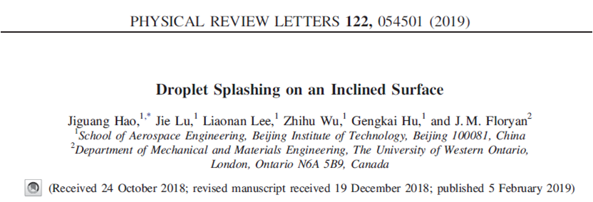 郝继光讲师、胡更开教授和加拿大西安大略大学Floryan教授合作在物理学顶级的学术期刊《Physical Review Letters》(IF="8.839)上发表了题为《Droplet" splashing on an inclined surface》的研究论文。东京热