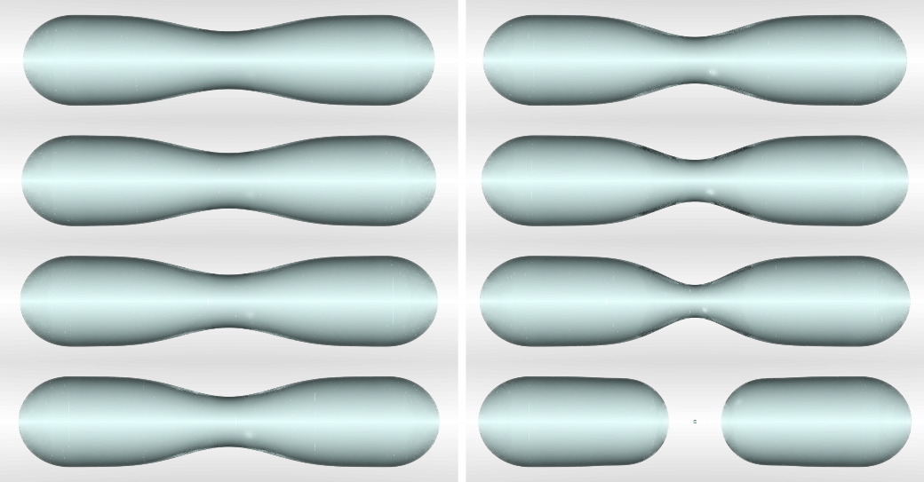 图. 典型受限丝状流体的断裂过程(数值模拟结果的光线跟踪渲染)