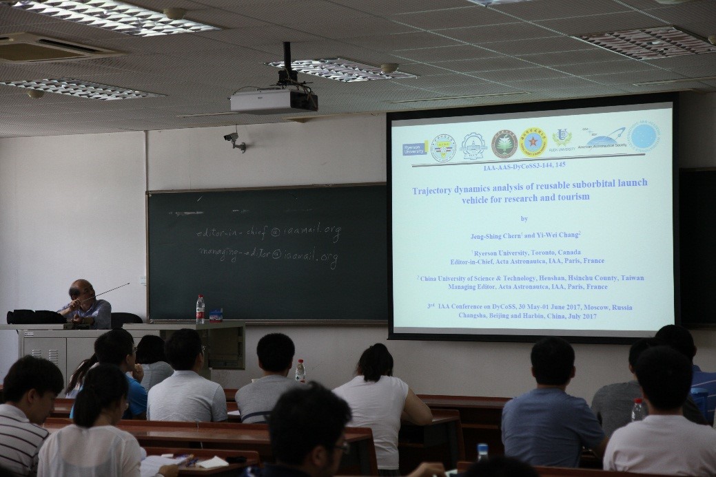 第二场报告题为“Characteristics of the trajectory dynamics of reusable suborbital launch vehicle(次軌道可重複使用載具之動力特性)”。通过结合阿波罗登月计划及太空观光旅行的现状,陈正兴教授探讨了次轨道可重复使用载具的动力特性,并就旅客在参加次轨道观光旅行前给予筛选和训练的必要性以及对于旅客身体和心里状态的潜在影响进行了简要介绍。