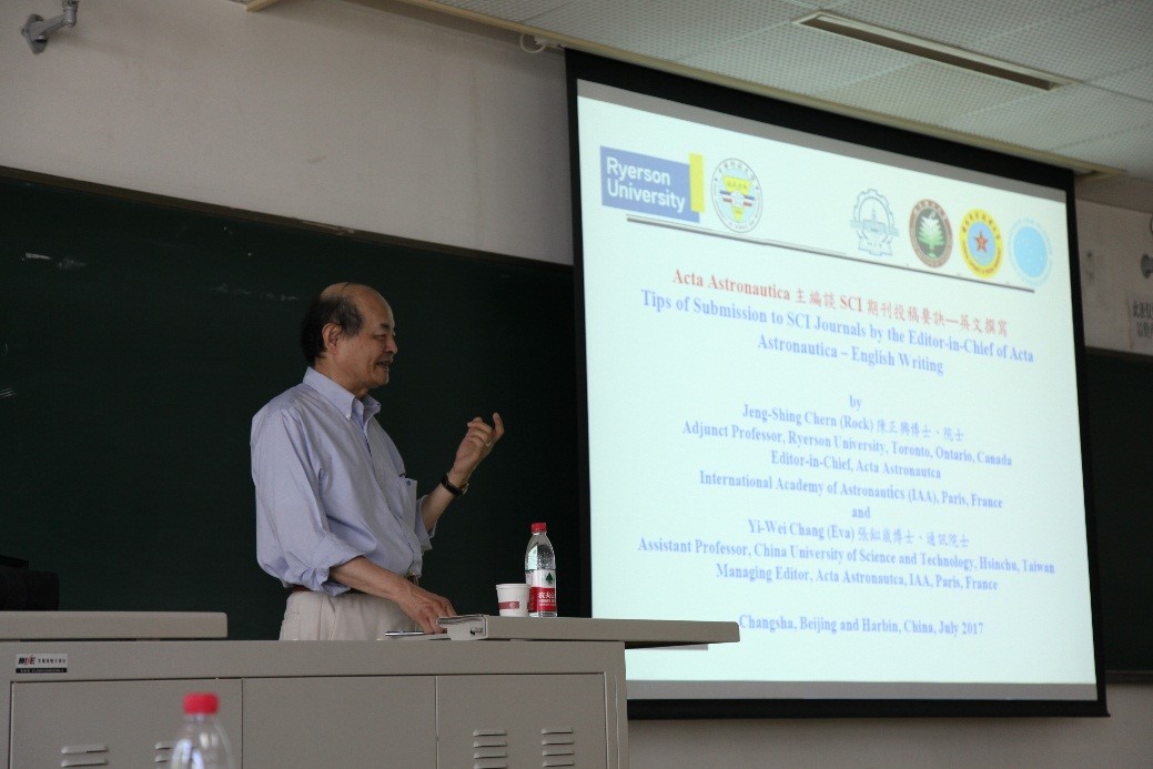 第一场报告题为“Tips of submission to SCI journals by the Editor-in-Chief of Acta Astronautica — English writing(Acta Astronautica主编谈 SCI期刊投稿要诀—英文撰写)”。陈正兴教授从一个期刊主编的角度,介绍了SCI期刊英文撰写的方法,并以投稿到Acta Astronautica期刊的论文为范例,详细讲解了论文题目、摘要、引言、正文、结论、参考文献以及图表等的写作规范和要求。